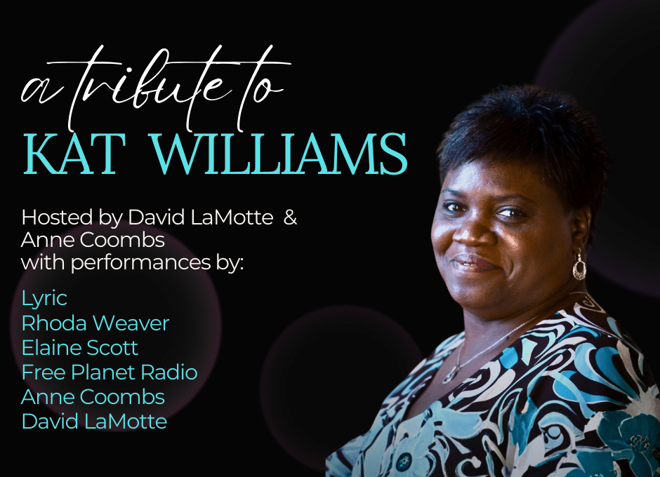 Hosted by David LaMotte and Anne Coombs, this special evening honors the legacy of an unforgettable artist, Kat Williams, with performances by Lyric, Rhoda Weaver, Elaine Scott, Free Planet Radio, Anne Coombs, and David LaMotte. All proceeds benefit Patrice Boudreaux.Presented by White Horse Black Mountain as part of our concert series at the historic Monte Vista Hotel.
